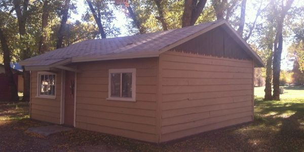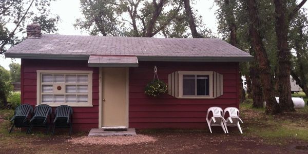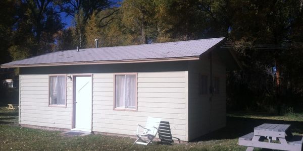 Cabin One is a spacious cottage with one queen size bed. Designed to be occupied by one or two people it is furnished with a couple of easy chairs as well as a dining table perfect for two. Cabin 1 also has a full kitchen and bathroom with a LARGE shower. There is a great view out the kitchen window of a branch of the Conejos river which meanders through the campground and the bridge that crosses over the river tributary.
